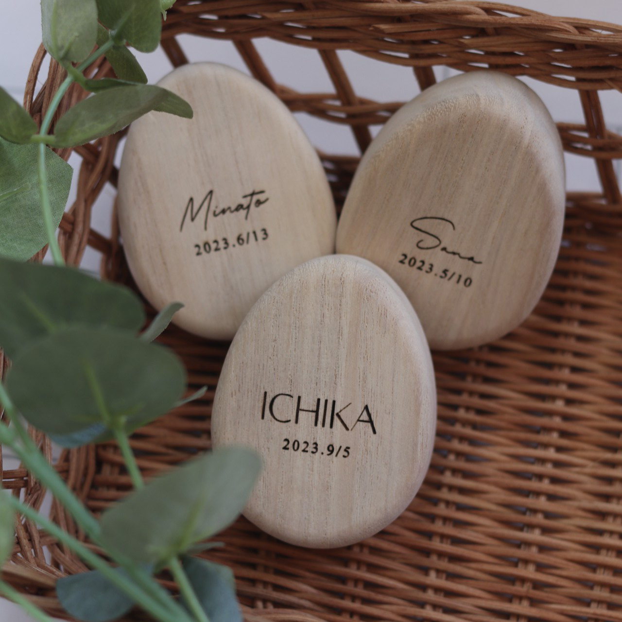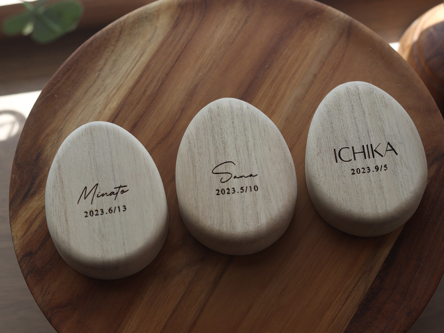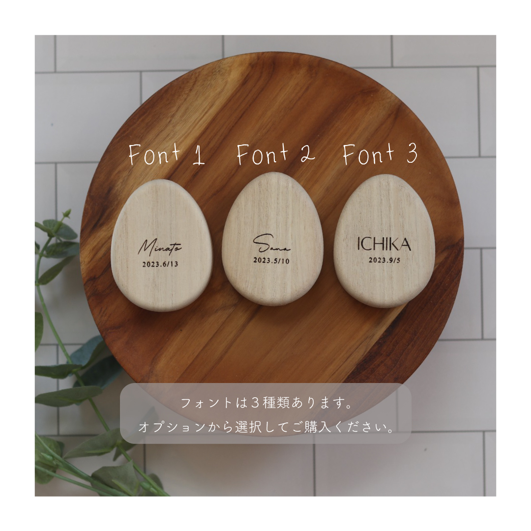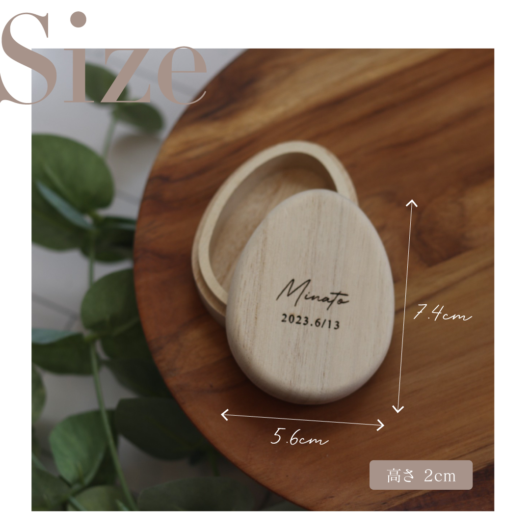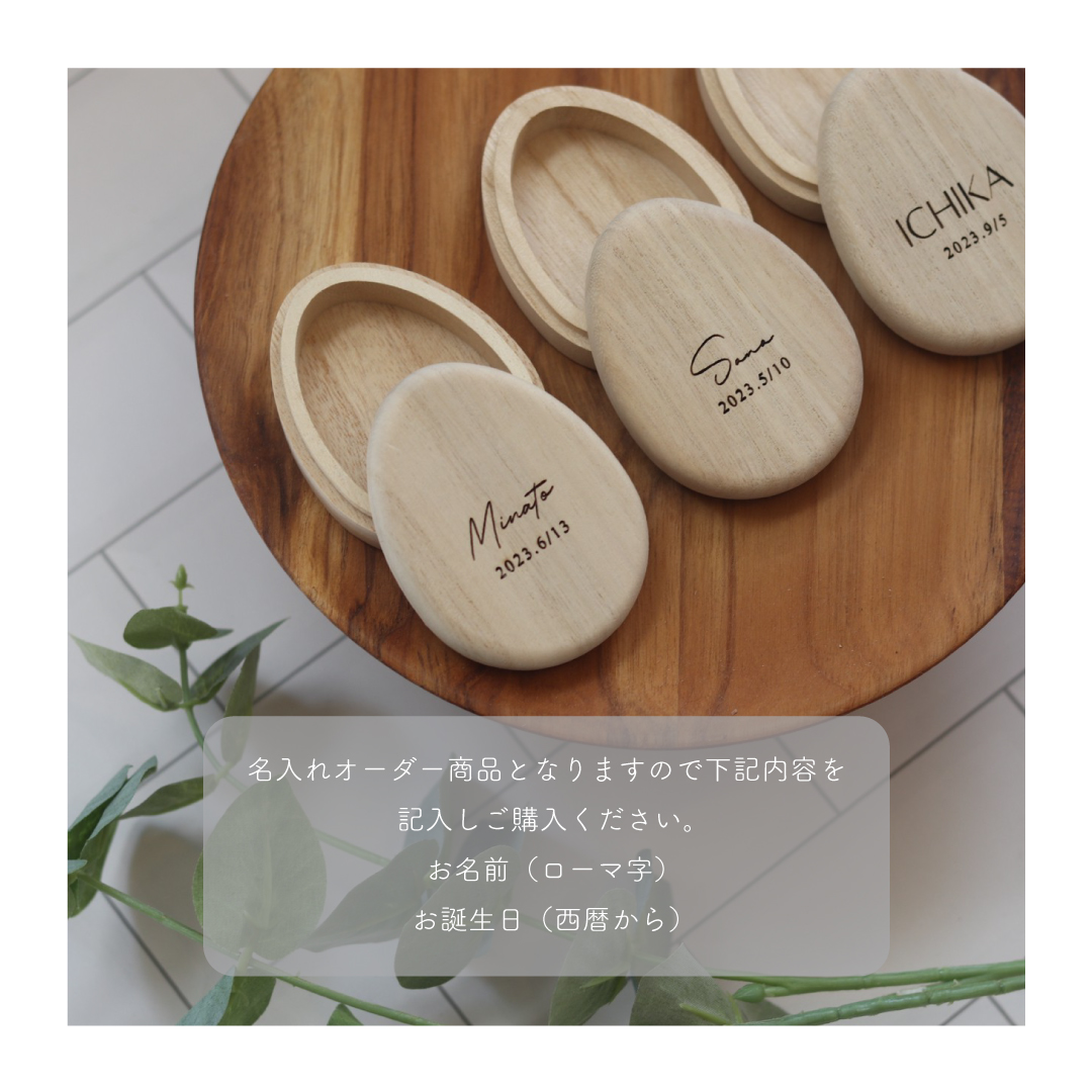 お名前とお誕生日を刻印した卵型の臍の緒ケース