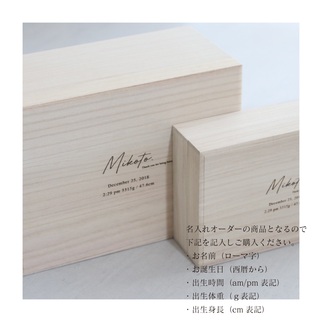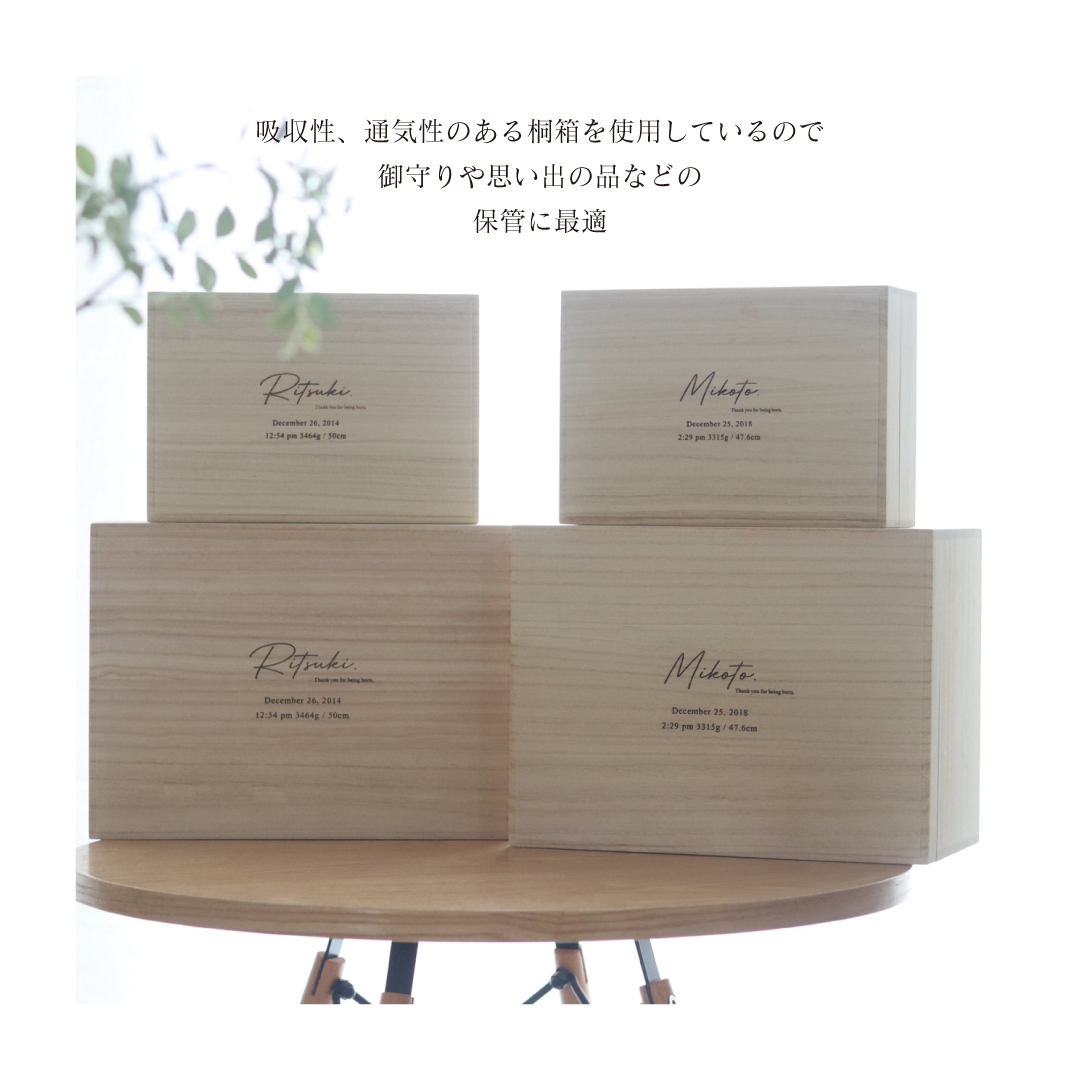 こちらはお守りや思い出の品などを保管できる名入れオーダーの桐製メモリアルボックスとなります。